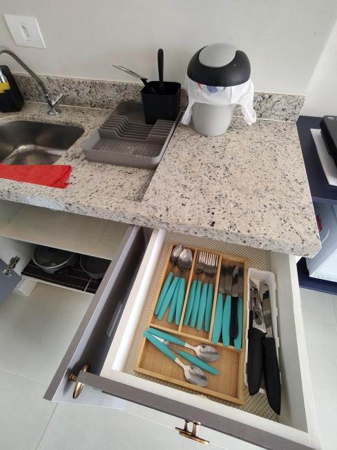 A cozinha conta com pia e armário embaixo da pia e armário aéreo, bancada de granito.