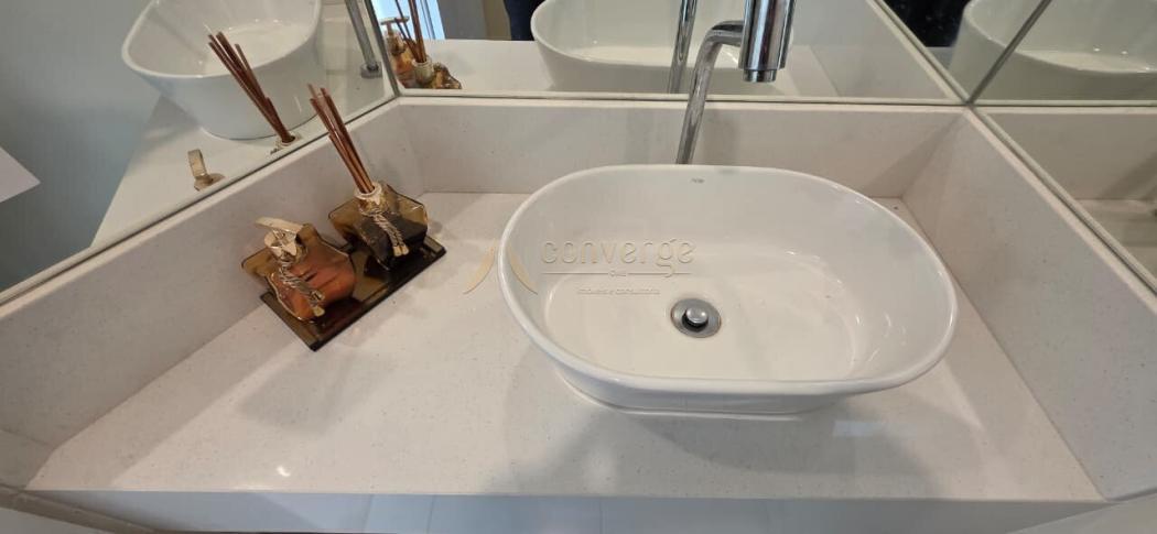 Banheiros equipados com cubas, mármore e acabamento sofisticado.